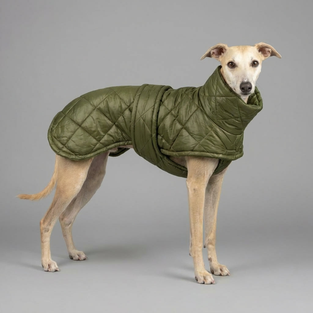 Ein Wintermantel für kälteempfindliche Hunde, gefertigt aus wasserabweisendem Steppstoff – ideal für Spaziergänge an kalten Tagen.