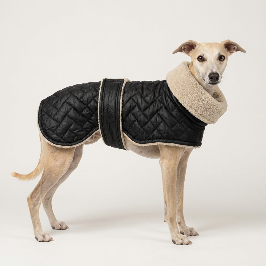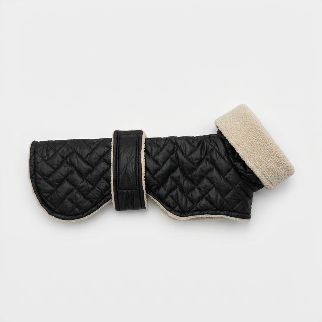 Ein Wintermantel für kälteempfindliche Hunde, gefertigt aus wasserabweisendem Steppstoff außen und wärmendem Teddyplüsch innen – ideal für Spaziergänge an kalten Tagen.